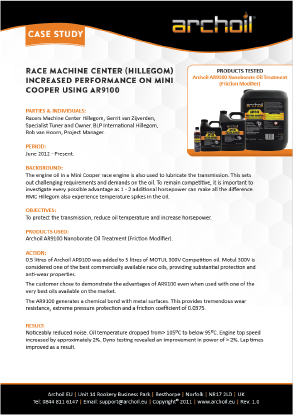 BACKGROUND: The engine oil in a Mini Cooper race engine is also used to lubricate the transmission. This sets out challenging requirements and demands on the oil. To remain competitive, it is important to investigate every possible advantage as 1 – 2 additional horsepower can make all the difference. RMC Hillegom also experience temperature spikes in the oil.