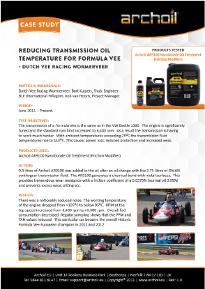 OBJECTIVES: The transmission of a Formula Vee is the same as in the VW Beetle 1300. The engine is significantly tuned and the standard rpm limit increased to 6,400 rpm. As a result the transmission is having to work much harder. With ambient temperatures exceeding 25OC the transmission fluid